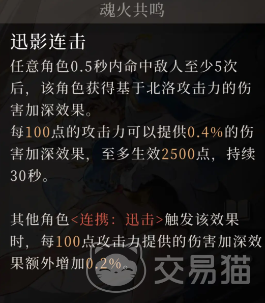 当北洛与柯尔特同时在场时,会触发名为“魂火共鸣·迅影连击”的协同效应。具体表现为:任意一名角色在0.5秒内命中敌人并累计达到5次攻击后,即可激活此状态,使队伍成员获得基于北洛攻击力计算的伤害加深效果。每100点攻击力可提升0.4%的伤害,最高叠加至2500点攻击力对应数值,持续时间为30秒。若另有其他角色成功触发连携迅击,则每100点攻击力所带来的增伤比例将进一步提升0.2%,实现更高的输出爆发。