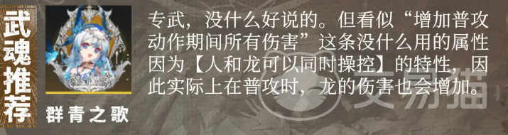 “群青之歌”是一种专属性质极强的武魂,专为伊莱莎设计并绑定使用。尽管表面看其增加普攻期间所受伤害的效果似乎不利,但实际上这一特性与其双形态切换机制紧密结合——当人形与龙形态同步行动时,龙形态的攻击也会受益于普攻增益,从而实现整体输出最大化,是目前最适合伊莱莎的核心武魂配置。