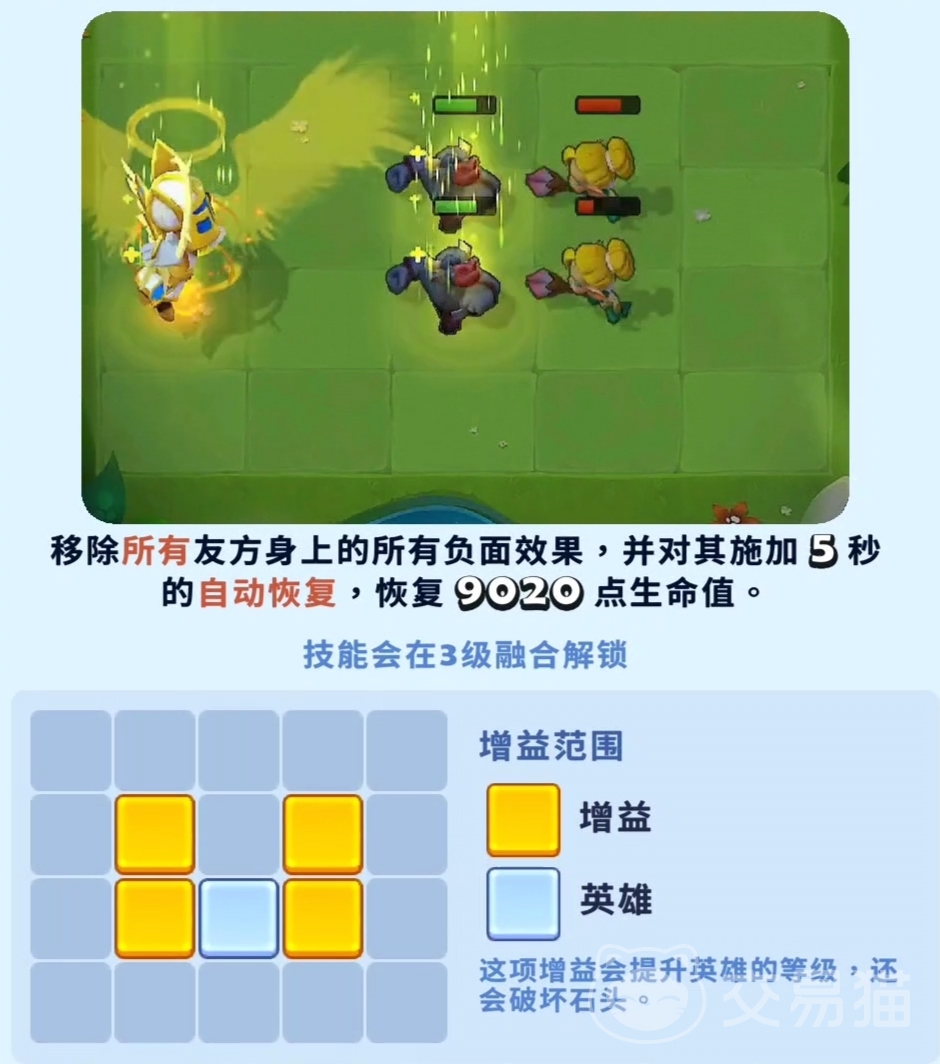 天使的核心技能将在3级融合后激活。释放后,她可以清除所有友方单位身上的负面状态,并为全体队友施加持续5秒的自动回复效果,总计恢复9020点生命值。这一技能在面对带有中毒、灼烧或减防类持续伤害的敌方阵容时尤为关键,能够在团战关键时刻扭转局势,有效防止队友暴毙,提升整体生存能力。