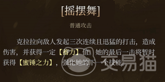 克拉拉的核心战斗逻辑围绕“蓄力值”展开,所有技能联动均依赖这一资源的积累与释放。作为重锤类武器使用者,她的战斗节奏与该类型武器机制高度契合。其普通攻击名为“摇摆舞”,可对敌人发动三段连续打击,每段命中均可造成可观伤害,并为自身累积一定量的蓄力值,为后续技能释放打下基础。