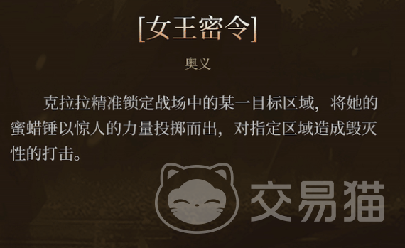 当该技能以蓄力形式释放时,除造成强力打击外,还可附加削刃效果,并额外获得“蜜锤之力”,用于强化下一个技能的输出能力。终结技“女王命令”则为远程范围攻击,克拉拉将锁定战场指定区域,投掷蜜蜡锤造成大范围伤害,适合清理密集敌人或压制关键点位。在蓄力充足的情况下,结合技能命中触发的派生链与“蜜锤之力”的叠加,可形成高强度的爆发连段。
