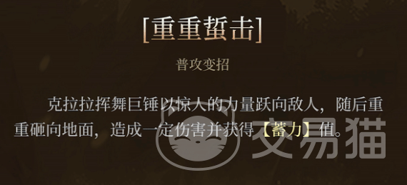 在普攻的最后一击命中后,克拉拉将自动获得“秘锤之力”状态,这是专属于她的强化机制。该状态可激活普攻的变招形态——“重重蛰击”。触发后,克拉拉会操控巨锤迅速突进至目标位置,并以强力砸地造成范围伤害,同时额外获取蓄力值,进一步加快主动技能的能量积攒效率。