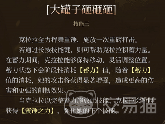 在技能二派生过程中,克拉拉将持续挥动巨锤对周围敌人施加高额伤害,并再次提升蓄力值。此时还会激活“蓄能之韵”状态,该效果基于当前蓄力值提供加成,在此状态下,所有技能输出均可获得更高的蓄力回馈,显著加快能量循环速度。技能三“大罐子砸砸砸”则是一项高爆发蓄力技,长按可逐步积蓄力量,在蓄力期间仍可移动调整位置。随着蓄力阶段推进,技能威力不断提升,同时阶段性消耗蓄力值以维持释放。