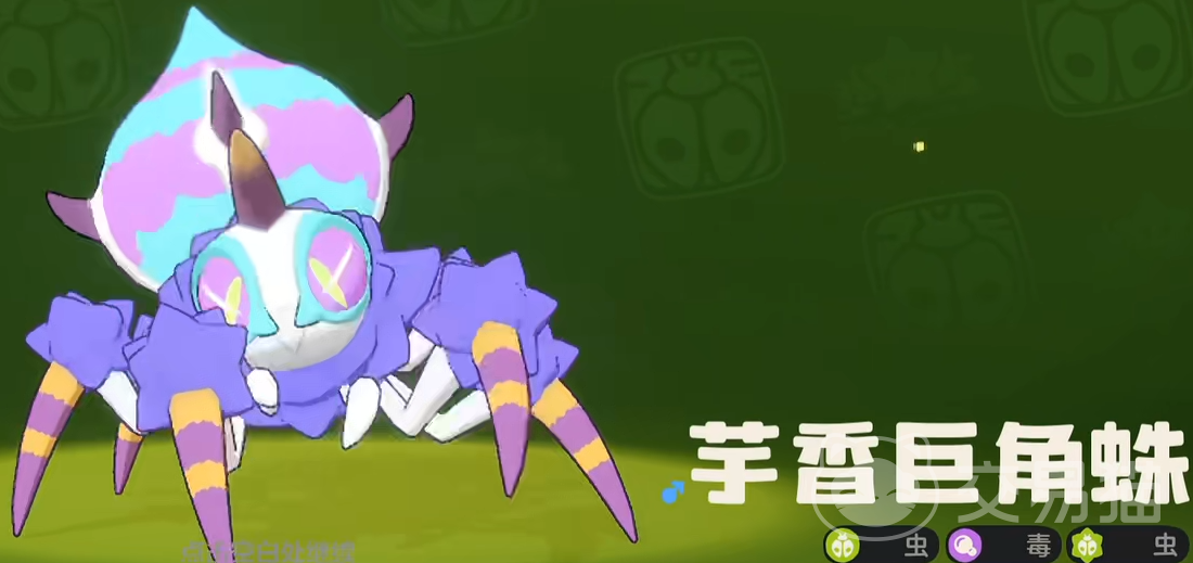 它的第一阶段进化体名为“尖角蜘蛛”,具备虫系与毒系双属性。最终形态为“芋香巨角蛛”,同样拥有虫、毒双属性。这三者共通的一个优势在于:释放消耗2点能量以下的技能时,能对对手施加最多4层中毒状态,因此非常适合构建持续中毒伤害流派。