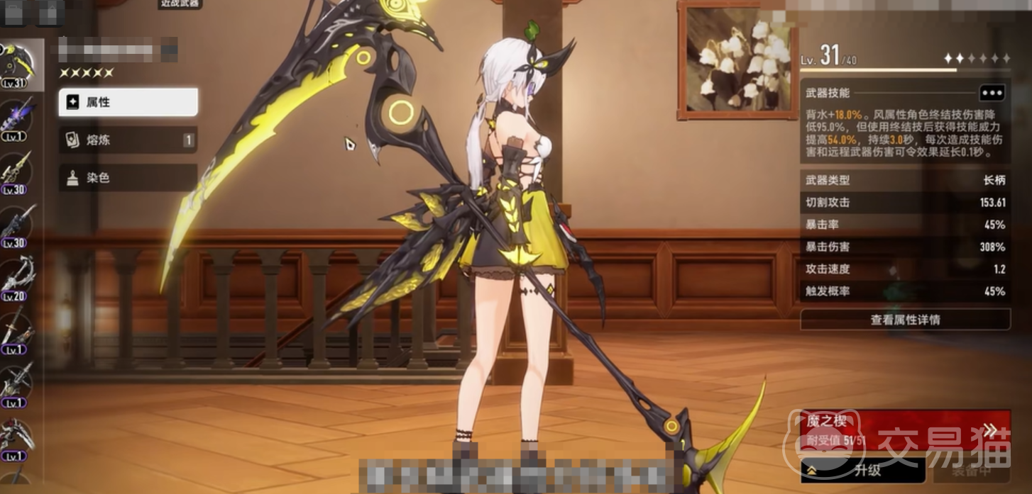 作为近战武器中的高机动代表,绯切在空中作战方面具备极强的优势,连招衔接顺畅自然,特别适合偏好灵活打法的玩家使用。在应对成群小怪时,其大范围横扫技能能够带来高效的清场体验,打击感十足。该武器的核心属性之一是“背水增益”,激活后可使角色获得15%的背水值提升,在低生命状态下大幅增强生存能力;另一项关键特性为“终结技强化”,在释放终结技后,技能伤害提高45%,持续时间为2.5秒,并可通过持续输出延长增益时间,非常适合需要长时间站场输出的职业。