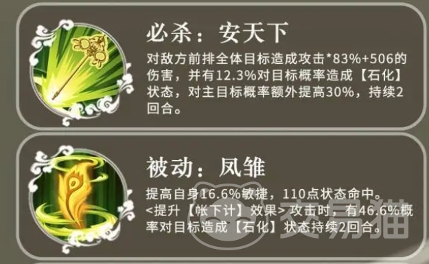 当敏捷属性达到理想水平后,可逐步补充命中属性,以确保控制技能稳定生效。阵法石的选择应侧重状态命中,优先考虑抗性状态类,其次是生命状态,最后才是命中类。研究方向建议优先保障生存能力,随后强化敏捷成长。通过合理的数据优化,可显著提升其技能命中表现。其必杀技“安天下”能对敌方全体前排造成85%基础伤害附加506点固定伤害,具备较强的前排破阵能力。