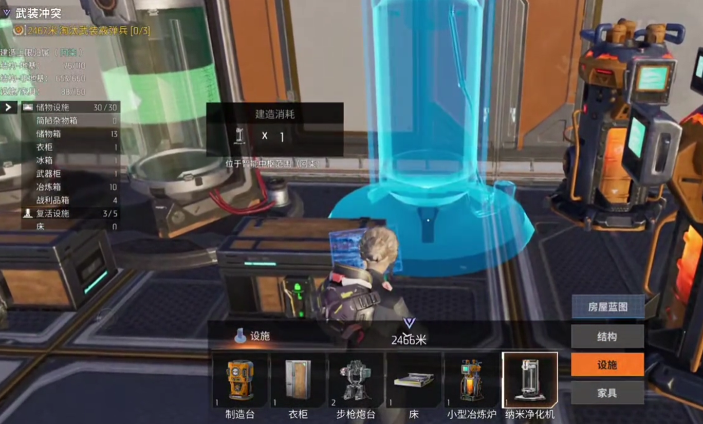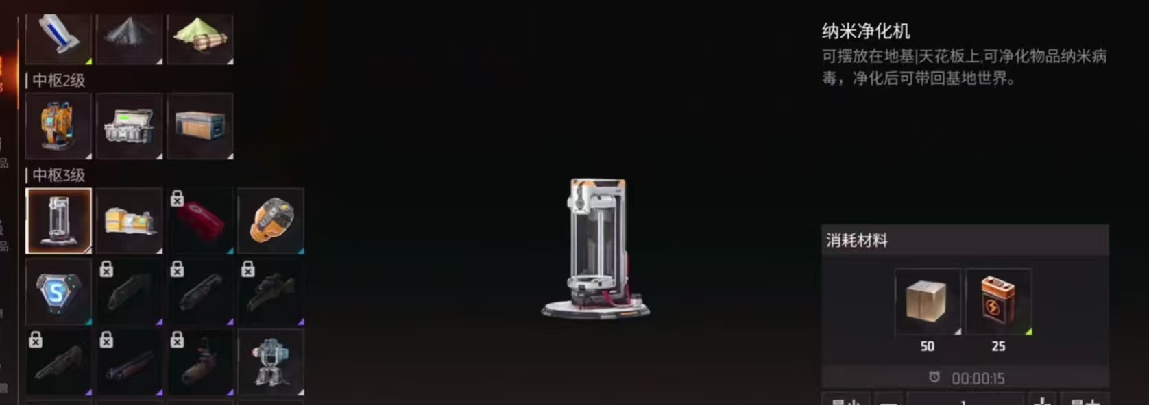 想要顺利将战局中的物资运回基地,首要条件是拥有一个工作台。工作台需通过零件解锁,建议在游戏前期优先建造。一旦获得工作台,即可打开制作界面,查找并制造“纳米净化机”。该设备是处理腐蚀物品的关键工具。制造完成后,需将其放置在战局中的合适位置,所有需要带回的物品都必须经过纳米净化机的处理,否则无法带离战场。
