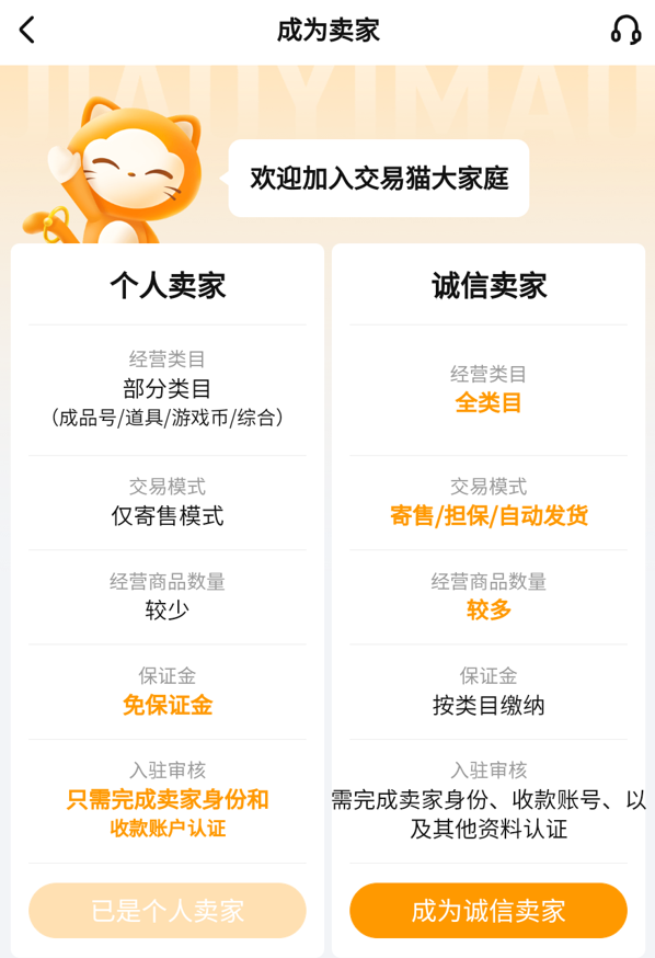 想要卖号的苹果用户打开浏览器搜索交易猫就能够进入官网,安卓玩家的话可以点击上方的按钮或者扫码直接下载安装。大家都知道在很多平台想要出售自己的账号需要缴纳一定保证金,而得益于依托支付宝以及阿里巴巴等大平台,在交易猫中以个人卖家身份上架账号商品免除了这一步骤,直接完成实名以及收款账户的认证就可以直接免费进行上架,等到成交完成之后再收取一定比例的服务费就可以了,不需要有额外的提前花销,这一点就十分靠谱了。当然了,同时多个账号也是可以的,在平台里升级认证就可以搞定。