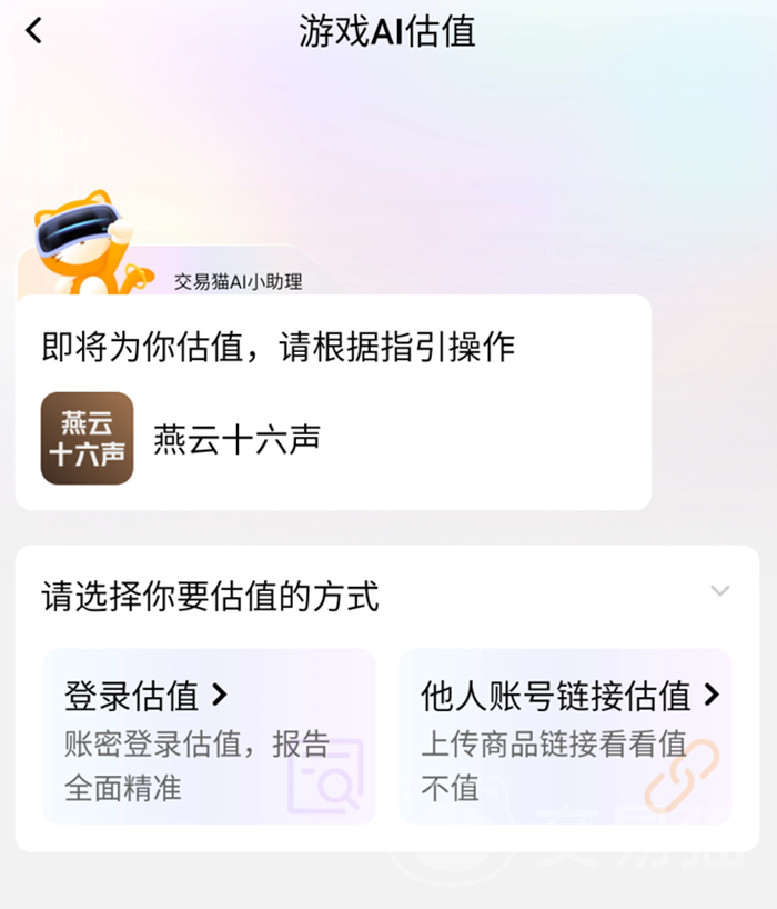 这里我们以热门的游戏燕云十六声为例,交易猫平台针对一些游戏提供估值服务,这个功能分为两部分,第一部分是针对卖家的账号估值。我们进入到股价工具中选择游戏,随后只需要选择登录估值,将自己的账号信息填写进去,平台会自动为我们采集账号内的一些高价值内容,比如说角色的等级、解锁的功法或者是皮肤时装等,并且结合当前市面上的整体行情完成精准估价。在对价格进行微调后就能够一键安排上架,不再需要大家手动去游戏里费力翻找、来回切换app填写账号内容。