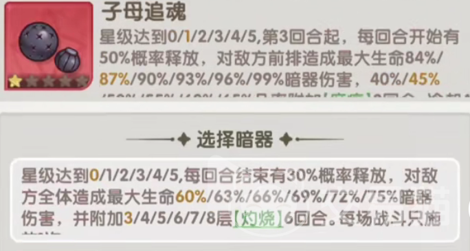 其次是子母追魂,这款暗器以精准追踪与爆发输出著称。当母弹命中目标后,子弹会迅速分裂并对锁定单位展开连环打击。在星级处于0到5级区间时,自第三回合起有50%概率触发技能,对敌方前排造成高达最大生命84%至99%的暗器伤害,并附带40%至65%的麻痹效果,持续影响第2至第4回合。此控制效果能有效打断敌方技能循环,延长其冷却时间,形成战场压制。凭借高额单体爆发与功能性控制,子母追魂成为突破敌阵的关键利器。