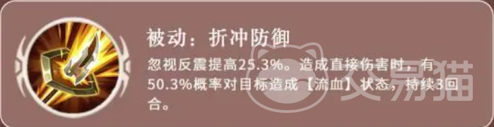 该技能可同时攻击敌方主目标及其左右两侧单位,共影响三人。基础伤害为攻击力的91%,并附加505点固定数值伤害。此技能后期还能提升35%的忽视反震效果,有效削弱敌方反击类防御机制。此外,释放时有约50%的概率清除目标身上的一个增益状态,尽管清除数量有限,但在关键时机仍能起到打断作用。被动技能“折冲防御”进一步增强了他对反震的抵抗能力。