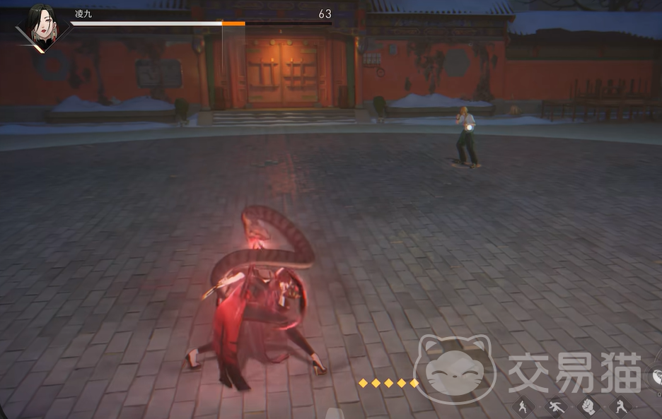 凌九的基础普攻以折扇为武器,可连续发动四段打击,动作流畅、衔接自然,攻击范围适中,适合在近身状态下持续输出。她的投技名为“却扇”,使用时会先控制敌人并用扇面遮挡其视线,造成短暂视野受限效果,随后绕至目标背后发起突袭,具备较强的起手能力和压制性。