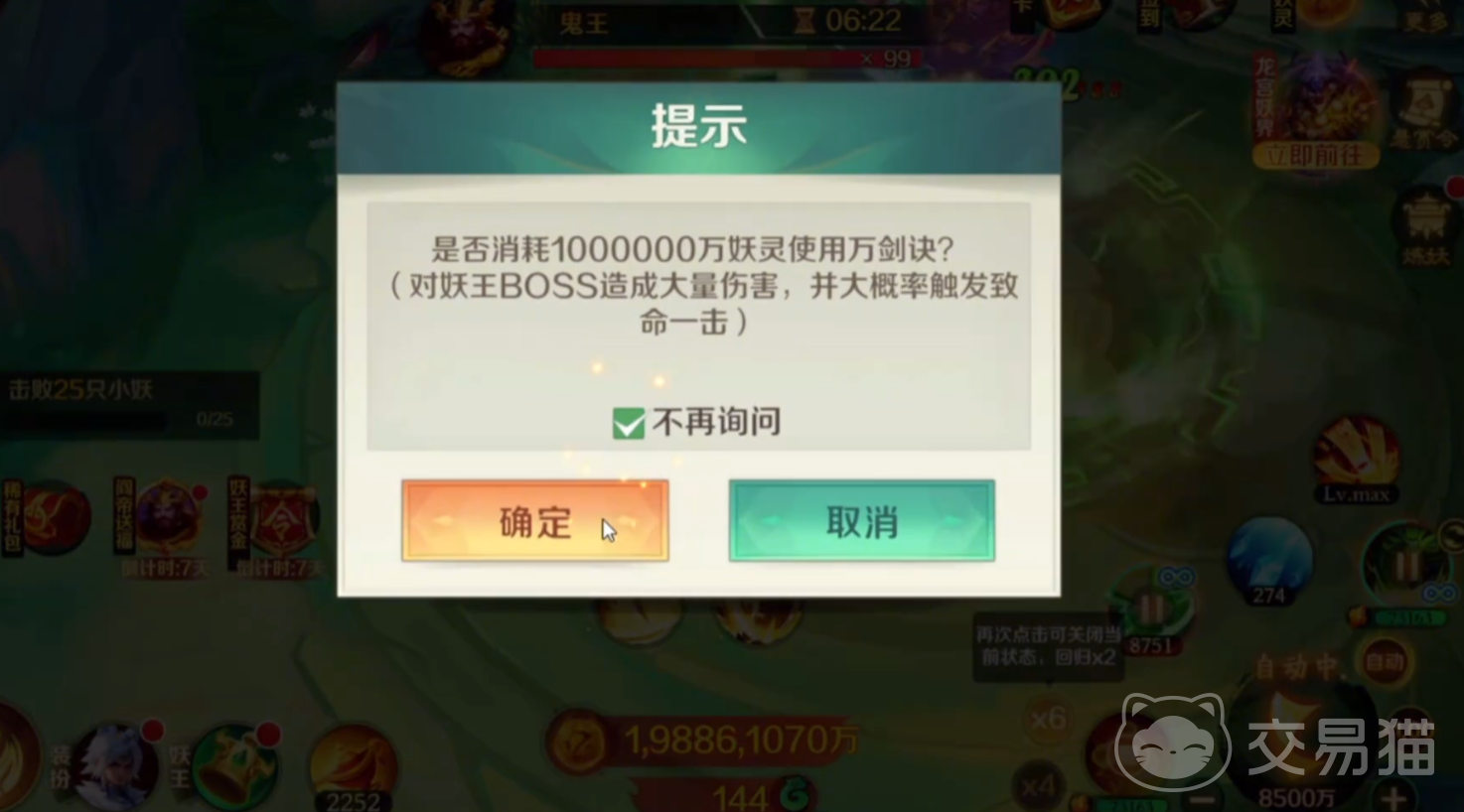 鬼王出现后,立即释放大招或其他高伤技能。若角色具备较高的防御与生命值,可不必刻意躲避其攻击,直接正面迎战以争取最大输出窗口。雷灵资源充足时,可消耗其召唤天神协助作战;若妖灵数量达标,亦可施展万剑诀造成爆发性伤害。在整个过程中,持续循环高效输出技能直至倒计时结束。