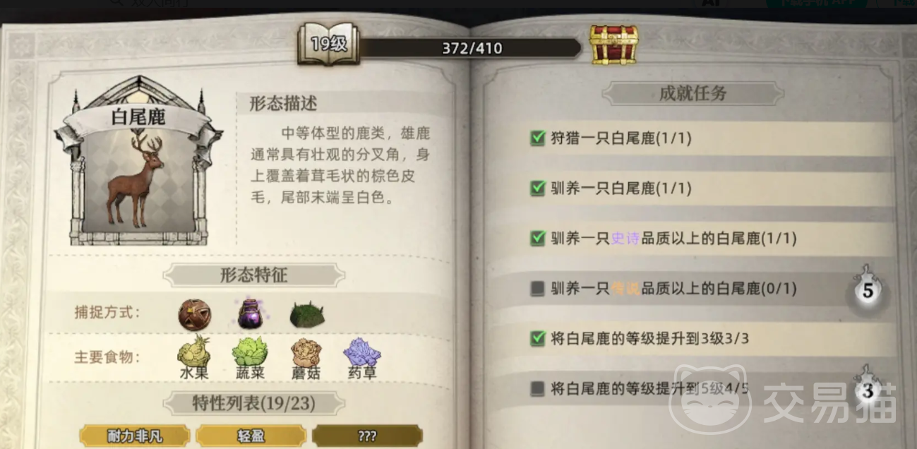 白尾鹿是一种常见于林地与草原地带的中型野生动物,雄性个体长有分枝状的角,全身覆盖着棕褐色的绒毛,尾巴末端呈明显白色,奔跑时尤为醒目。作为坐骑,它拥有稳定的移动速度和良好的地形适应性,同时具备采集木材与石材的基础能力,是早期探险阶段的理想选择。