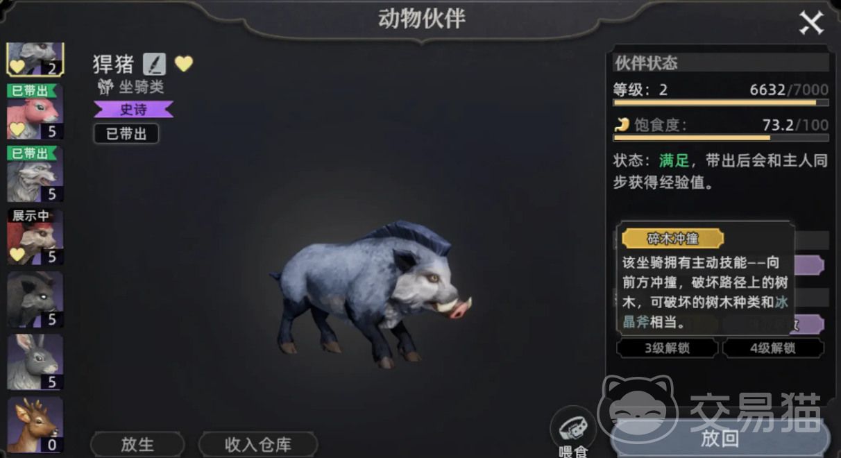 悍猪主要出没于沃维森林南岸北部的红树林区域,其主动技能“碎木冲撞”可沿直线发起强力撞击,清除路径上的树木障碍,可破坏的树种范围与冰晶斧相当。这一特性使其成为资源采集效率极高的功能性坐骑。