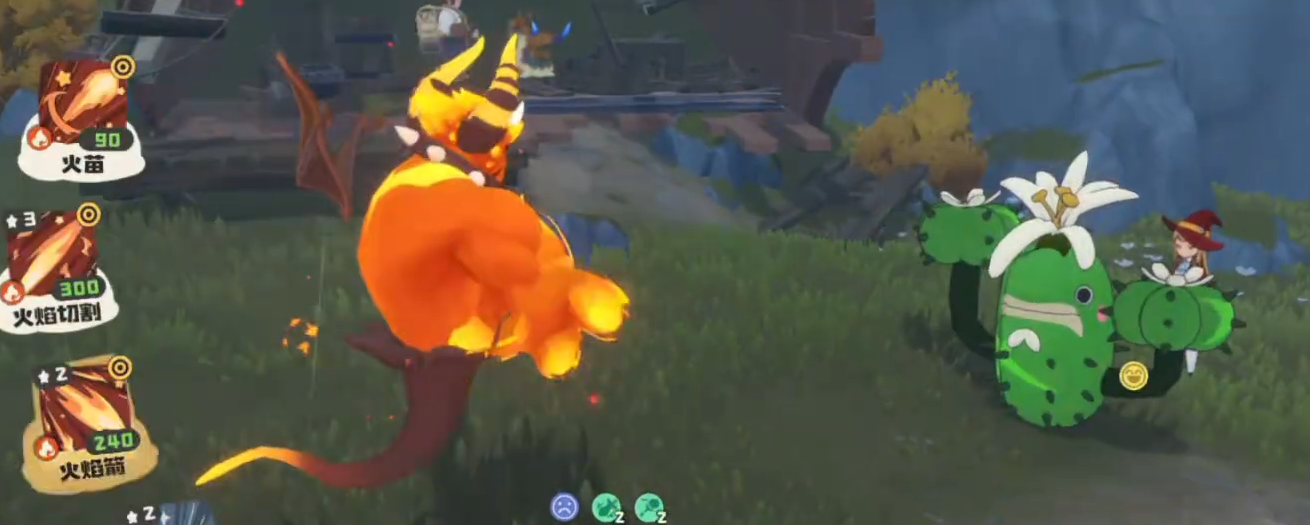 接下来出场的第二和第三只精灵依然是毒+草系的蹦蹦花,尽管头顶小草呈现紫色与粉色差异,但属性未发生改变,依旧惧怕火系攻击。继续使用“火焰切割”即可高效清除,整个过程流畅无压力。可以看出,这套阵容设计似乎特别适合火神发挥优势。