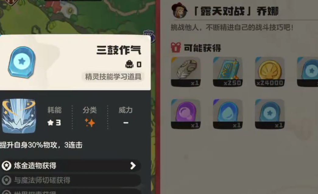 得益于火神自带的“助燃”特性,在低消耗情况下仍能稳定输出。面对前两只带有异常状态能力的蹦蹦花,使用二星技能“火焰剑”即可顺利击败。最后一只蹦蹦花头顶为红色小草,属于标准形态。凭借属性压制优势,合理操作下可轻松赢得整场对决。成功战胜乔娜后,玩家将获得智慧羽毛、经验奖励、洛克贝以及多本实用技能书,包括三鼓作气、溶解液、水刃和能量炮,资源回报相当可观。