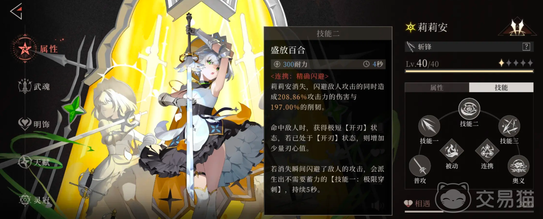 作为一位坚毅果敢的骑士型烬天使,莉莉安以剑术见长。她的普通攻击由五段连续斩击构成,在第二至第四段普攻期间可触发魂技,转变为更高效的连击模式,提升整体伤害输出。技能“除恶务尽”会先举剑格挡并持续对周围敌人造成多段打击,最终消耗耐力释放终结一击,打出高额爆发。“盛放百合”则使她瞬间位移,在目标前方布下剑阵,此过程中自身处于无敌状态但不造成伤害;