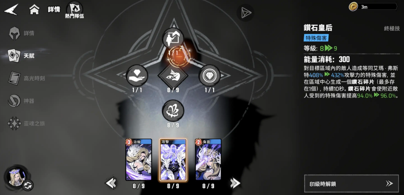 接下来推荐点选“神锤神威”,这项天赋专注于增强终极技能的联动效果。它不仅扩大了普攻的连锁传导范围,还显著提升了整体伤害输出,特别适用于敌人密集的战斗场景。在主打速攻的阵容中,这一天赋能有效加快清场节奏,提升推进效率。