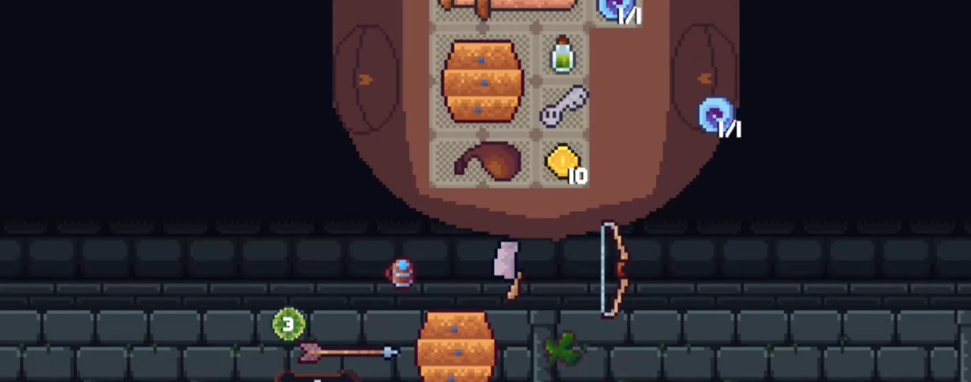 流派三:弓箭流。与其他近战武器不同,弓箭系统由“弓”和“箭”两个独立部件组成,必须同时存在于背包中才能发动远程攻击。其中弓具占用空间较小,一般仅需3至4格即可满足需求;而箭矢种类丰富,包括短箭、普通箭、弯曲箭等,各自占据不同格数——例如短箭仅占1格,弯曲箭则需3格。因此在搭配时,需结合剩余容量与单次攻击伤害进行权衡,优先选用性价比高的箭种,确保在有限空间内实现最高输出效率。