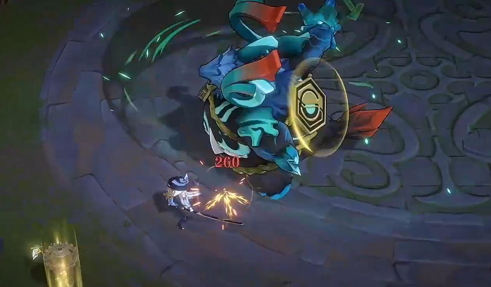 Boss全身仅有背部存在弱点,所有攻击应集中于此部位以最大化伤害收益。尽管单次攻击数值并不突出,血量较高的角色通常可承受约十次打击而不倒,但其连招频率高且衔接紧密,对走位要求较高。因此战斗过程中需保持移动节奏,避免被连续命中导致无法脱身。