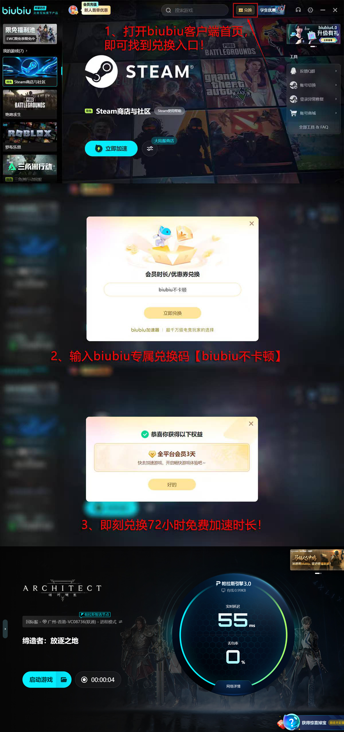 对于新用户而言,现可享受一定时长的免费加速服务。输入口令【biubiu不卡顿】可在首页兑换3天使用权益,注册后还可额外获得24小时试用时间,合计最高可达96小时。需要提醒的是,只有通过biubiu加速器启动游戏,才能确保获得稳定的加速支持,从而顺畅体验《缔造者放逐之地》的完整内容。