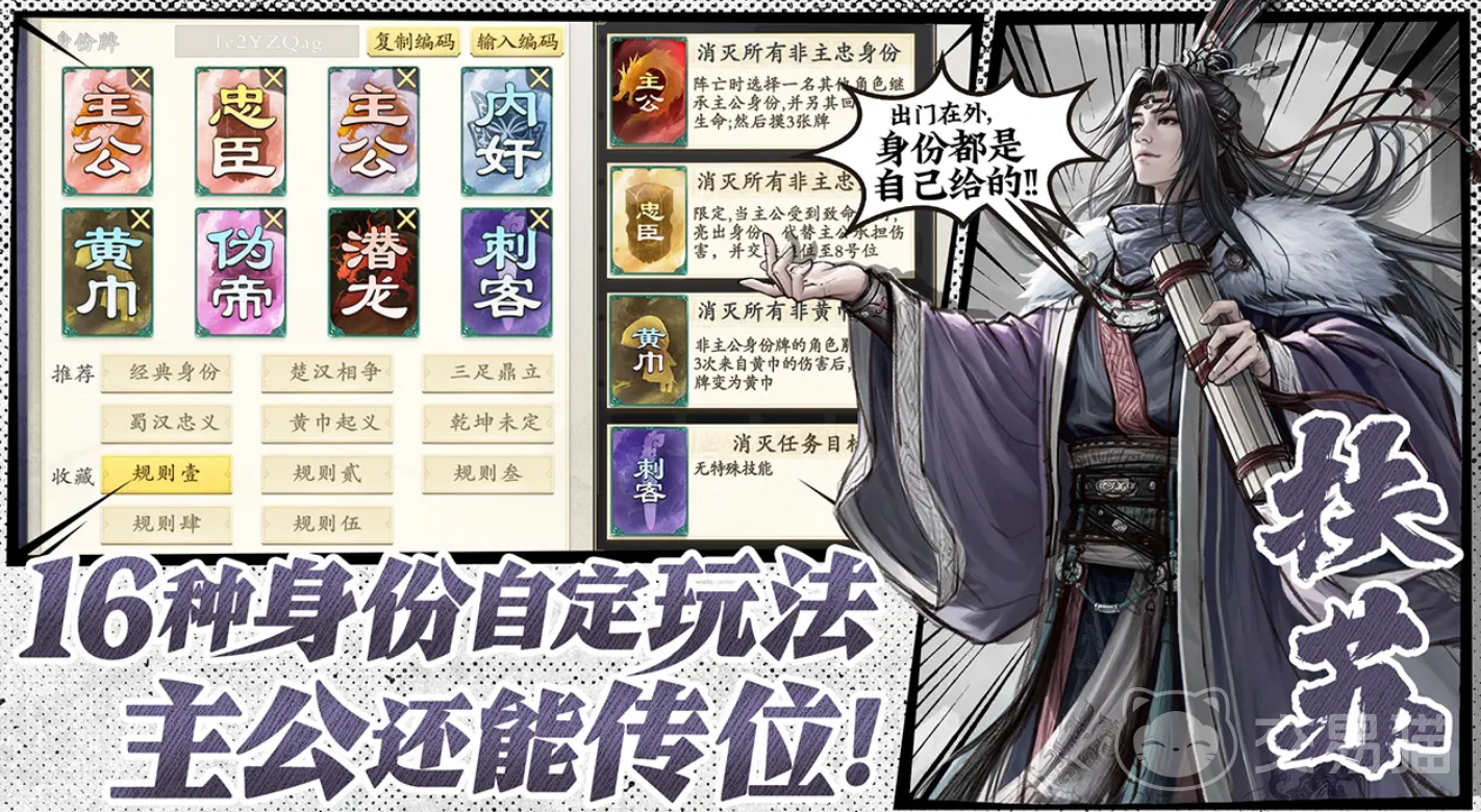 本作是一款以多身份设定为核心的策略对战类卡牌游戏,内置主公、忠臣、内奸、伪帝、黄巾、潜龙、刺客等多种身份类型。每局游戏中,各玩家所持身份不同,胜利条件也随之变化,极大提升了战局的不确定性与策略深度。