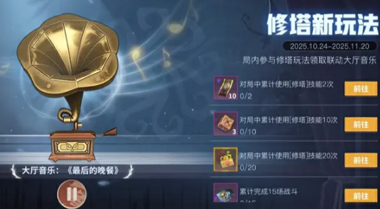 在活动期间参与“修塔”玩法,可获得包括祈福绘马、花札在内的多种实用道具。此外,完成指定挑战还能解锁限定音乐《最后的晚餐》,该曲目作为本次联动的重要组成部分,具有较高的收藏价值,喜爱该主题音乐的玩家切勿错过获取机会。