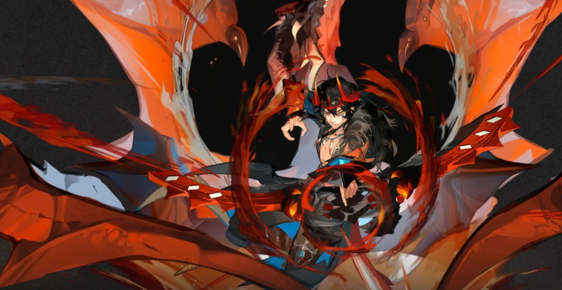 赤荒以长弓为主要武器,普通攻击由三段远程射击构成,可对敌人造成持续伤害并积累觉醒值。攻击过程中会触发“弓斗术”,释放近身斩击,并叠加多层“狂龙刻印”。其被动技能可在满足条件后进入觉醒状态,获得幻影效果,在持续时间内使自身伤害倍率翻升;