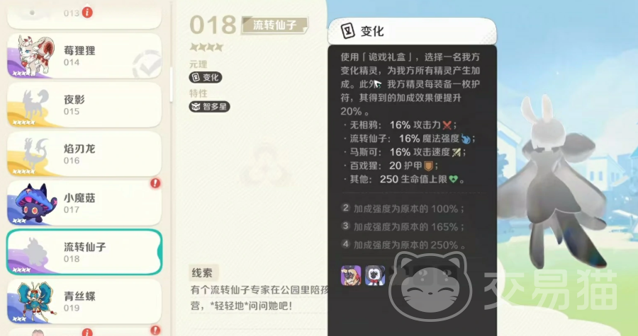 流转仙子归属于“变化元理”体系,其专属原理技能为“轨迹礼盒”。该能力允许玩家选择一名我方变化系精灵,为其提供属性增益。若该精灵装备有护符,则增益效果可额外提升20%。值得注意的是,护符带来的加成与角色形象选择密切相关,不同形态可能激活不同的属性加成路径,因此在配置时需结合阵容策略进行调整。