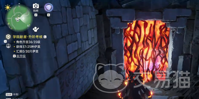 门前同样布满荆棘,需再次利用小炭犬的火焰技能清除障碍。进入房间后需完成一项能量收集任务,跟随漂浮的蓝色能量球即可顺利完成。随后的探索区域将遭遇碎岩仔,并有机会采集大量土灵碎晶。部分宝箱隐藏较深,有些位于无光照的岩壁旁,周围伴有微弱蓝光特效,可通过观察这些细节发现并获取奖励。
