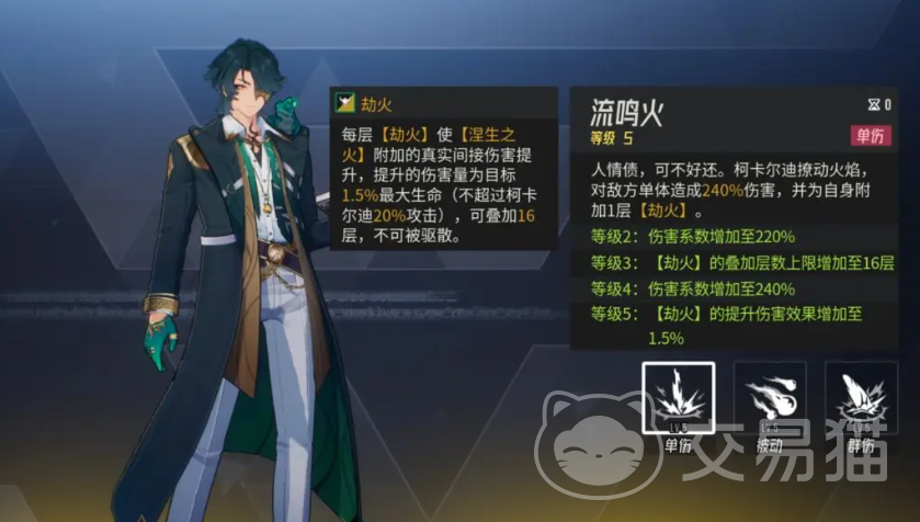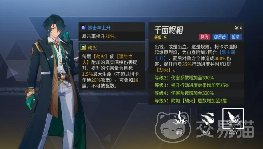 由此可见,柯卡尔的普攻不仅具备可观输出能力,还能通过被动机制实现自我强化。而在面对多个敌人时,他的终结技千面烬相则展现出强大的群体打击能力。释放后可对全体敌方单位造成360%的范围伤害,同时提升自身35%的行动进度,并额外获得三层劫火。此外,技能还会使自身的暴击率提升,增益效果可持续两个回合,使其后续输出更加稳定高效。