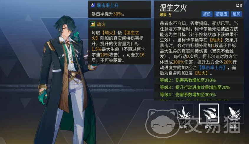 不过,若柯卡尔处于控制状态,则无法触发免选机制。当其积累足够层数的劫火并成功暴击时,被动将额外触发一次附加伤害,该伤害依据目标最大生命值的百分比计算,造成相当于300%倍率的真实伤害。与此同时,还能为全体队友提供20%的行动进度推进,并赋予暴击率提升效果,持续两个回合,同时自身再获得两层劫火叠加。