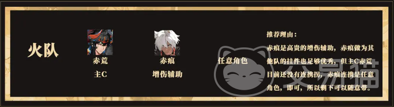 最后介绍的是火属性阵容,该体系内有两个固定核心角色——赤荒与赤痕。前者作为主要输出者承担绝大部分伤害任务,后者则是提供真实伤害加成的关键辅助。尽管目前赤荒尚无专属连携搭档,但赤痕的辅助效果可与任意角色触发,通用性强。虽然跨属性触发时增益数值低于同属性组合,但仍具备可观实战价值。因此第三位角色可自由选择,无论是增益类辅助还是回复型支援,均可根据关卡需求灵活配置。