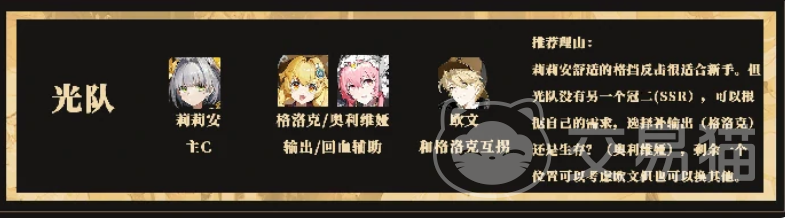 对于偏好光属性阵容的玩家,建议搭配莉莉安、格洛克和欧文。该组合中莉莉安为主力输出,同时具备反击格挡机制,操作友好,适合新手过渡。格洛克可为全队提供增益状态,强化整体作战能力;欧文则与格洛克形成辅助联动,进一步优化资源分配。需要注意的是,当前版本缺乏第二位冠2级别的光属性角色,因此最后一个位置可根据实际需要替换为功能性更强的单位。例如放弃格洛克转而启用奥利维娅,她作为治疗型辅助可大幅提升队伍续航能力。至于欧文,虽前期易获取,但后期替代空间较大,只需确保新角色能与莉莉安产生有效的连携响应即可。