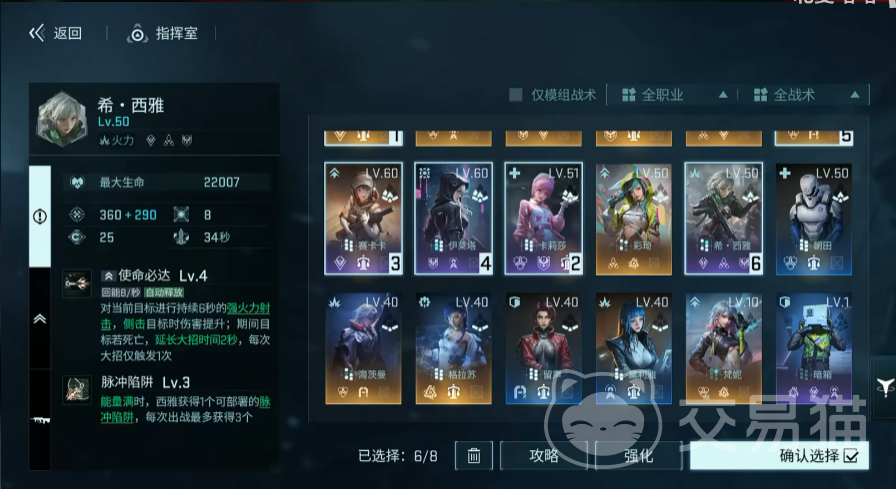 希·西雅作为初始即可解锁的角色,拥有优秀的爆发能力和群体打击表现。她的主动技能“使命必达”可在6秒内持续扫射当前目标,若攻击处于侧翼的目标,则伤害提升25%,非常适合切入战场薄弱点。第二个技能“脉冲陷阱”允许她在能量充满后部署最多3个可自动攻击周围3格范围内敌人的装置。被动天赋“战为自由”会在场上存在脉冲陷阱时叠加伤害增益,而三技能“矢志追随”则降低陷阱部署消耗2点费用,并使每场战斗可携带数量增加1个,显著增强持续作战能力。