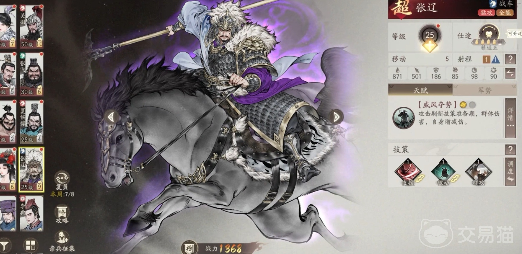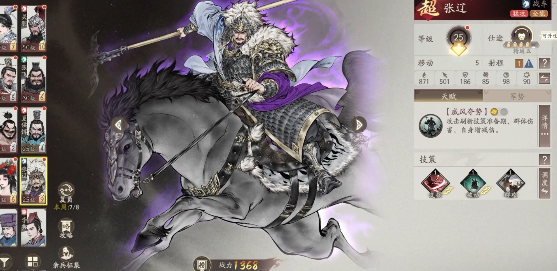 首选推荐:张辽,这位武将是前期性价比极为突出的选择,尤其适合非氪金玩家作为开荒主力。他在主动进攻时能禁止对手反击,有效克制依赖反击机制的近战型武将,在战斗初期即可建立优势。其技能可对直线路径上的敌人造成伤害,当命中两个或以上目标时,自身会进入“无法被选中”状态,非常适合执行突袭与敌后干扰任务。转职为骑兵后,将激活群体增益技能,不仅能提升周边友军战斗力,还可使己方骑兵单位附加“缴械”效果,兼具输出与团队辅助能力。整体来看,张辽无论是在前期争夺资源点,还是后期参与阵地战、奇袭作战中,都能保持稳定的发挥,适用场景广泛。