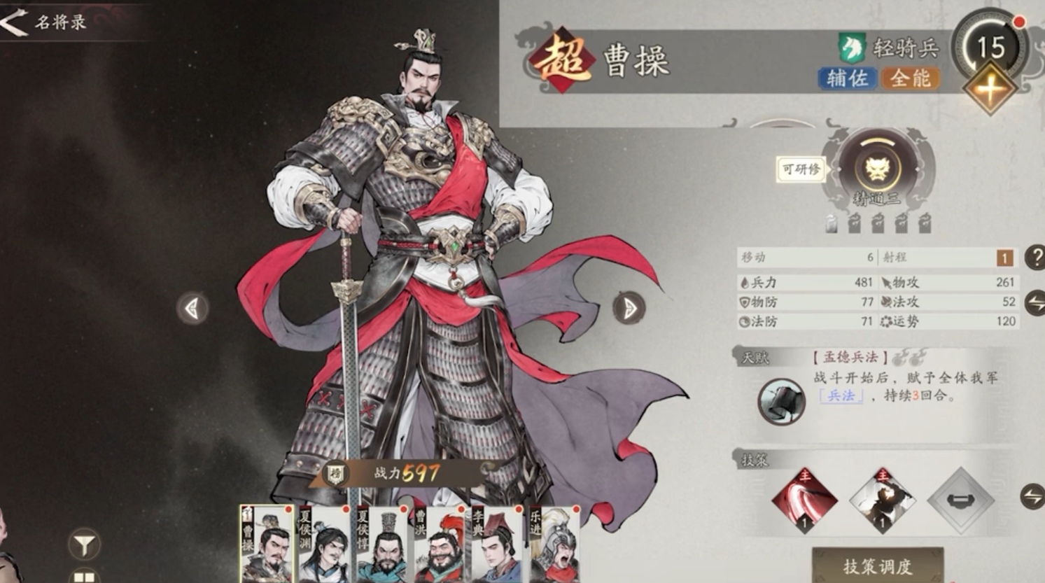 核心辅助:曹操,作为初始赠送的角色,拥有极强的团队辅助能力,同时具备可观的输出潜力,可胜任辅助位或副输出位置。其天赋可在战斗开始时为全体队友附加“兵法”增益,大幅提升攻防属性,是目前版本中唯一具备光环类技能的武将,战略地位极高。培养难度较低,成长空间大,非常适合新人玩家快速上手并建立早期优势。