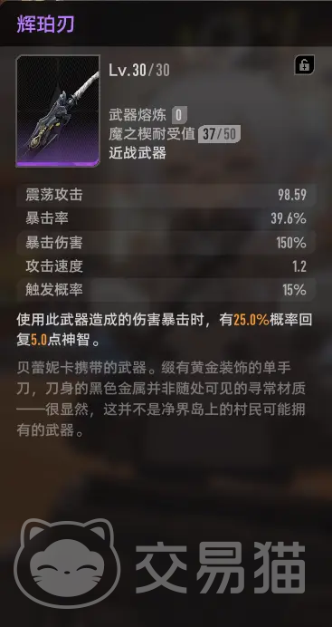 作为游戏早期即可获取的紫色品质武器,辉珀刃最大的亮点在于其独特的神智值回复机制。每次攻击触发暴击时,有25%的概率恢复5点神智值,这一特性极大缓解了前期资源紧张的问题。对于依赖技能输出的角色而言,能够更频繁地释放核心技能,在面对强敌或群怪时占据优势地位。