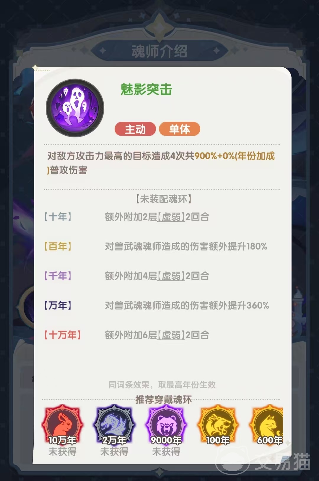 鬼魅的核心主动技为“魅影突击”,该技能锁定敌方攻击力最高的单位,并发动多段攻击。当魂环年限提升后,此技能还会附加虚弱状态,降低目标的攻击力。此外,他对拥有兽武魂的对手可造成额外伤害,在面对此类敌人时优势明显,适合针对性地部署出场。