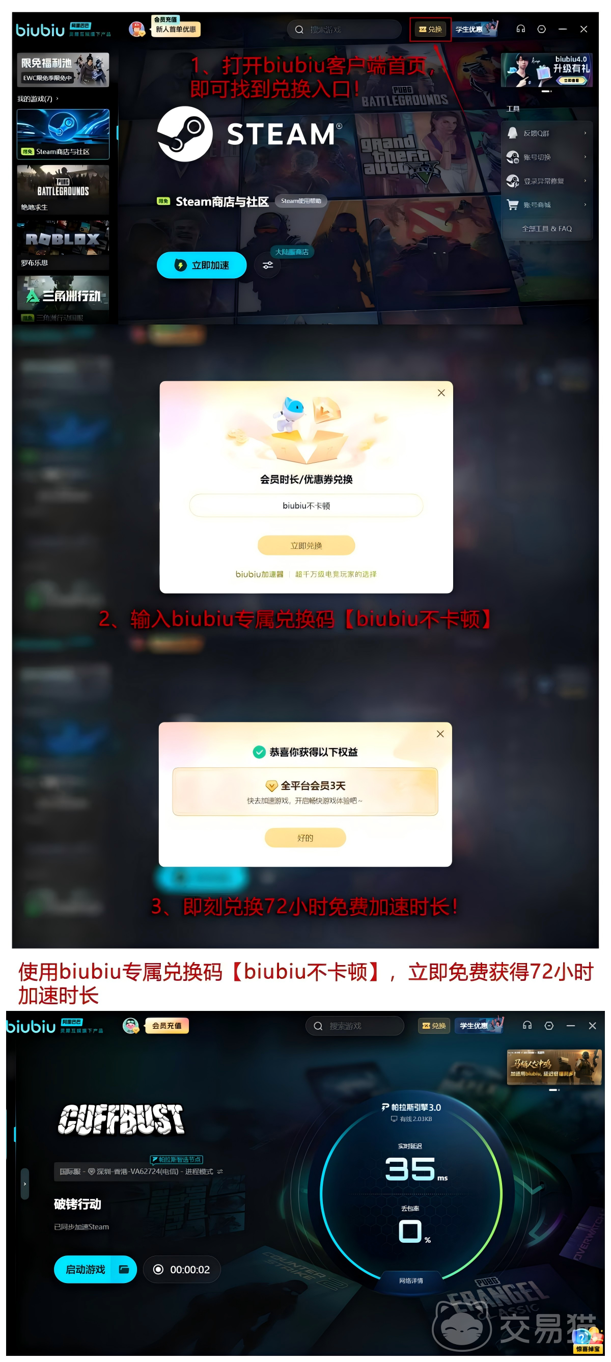在【兑换】页面输入口令【biubiu不卡顿】,即可领取3天免费加速服务,此外如果是首次注册的新用户,还将额外获赠24小时使用时长,合计可享受96小时的高速稳定连接体验。开启后台挂机加速后,能够显著降低丢包率,实现接近零延迟的联机效果,充分感受cuffbust的多人协作魅力。