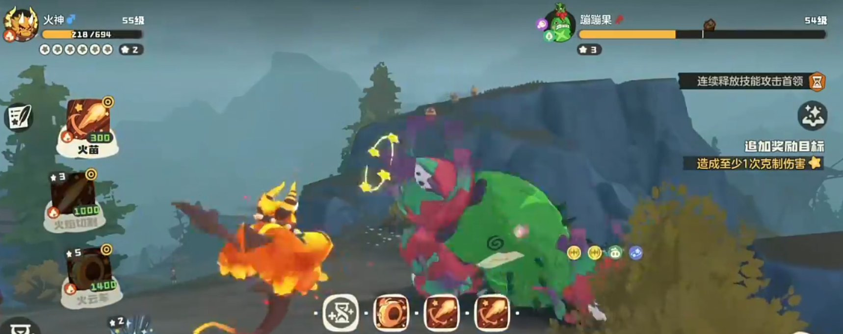 进入对战初期,因前一阶段的影响,蹦蹦果处于短暂眩晕状态。此时应迅速使用“力量增效”技能,提高输出效率。不久后,boss将发动七星级草系绝招“光能聚焦”,该技能本身威力极高,叠加首领五星级以上技能伤害翻倍的规则,极易造成秒杀。因此,若未选择生命增益,极可能无法承受此次打击。只要成功抗下这一击,后续利用“火焰切割”、“火苗”等常规火系攻击即可稳步压低血量,最终取得胜利。