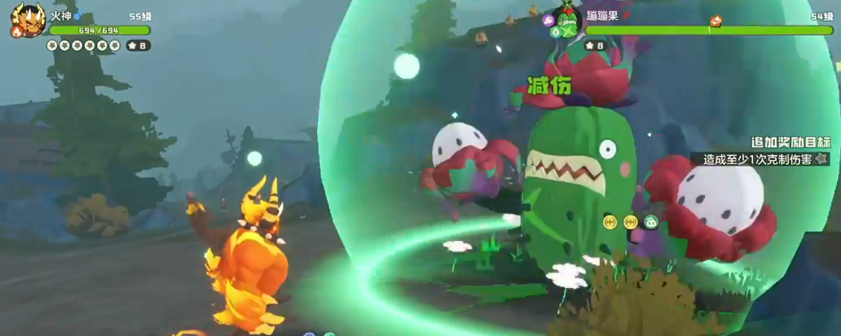 当首领护盾被击破后,系统将提供三项增益选择。若队伍缺乏物理攻击力加成,推荐优先选取生命值提升效果,以增强生存能力,随后进入第二阶段的精灵对战环节。鉴于蹦蹦果属草系,建议直接派遣具有属性优势的火系精灵“火神”出战。