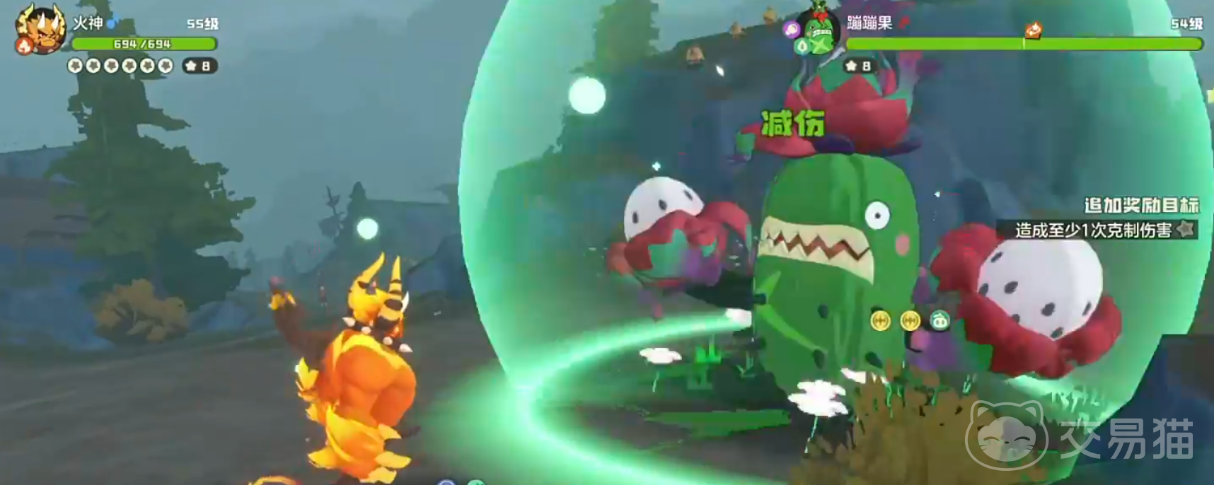 蹦蹦果拥有“生物碱”特性,每次释放技能后会为敌方附加两层中毒状态,且自身属性为草+毒组合,具备较强的持续伤害能力。战斗分为两个主要阶段,第一阶段以环境互动为主,此时蹦蹦果不会使用复杂技能,主要通过跳跃方式进行大范围打击。