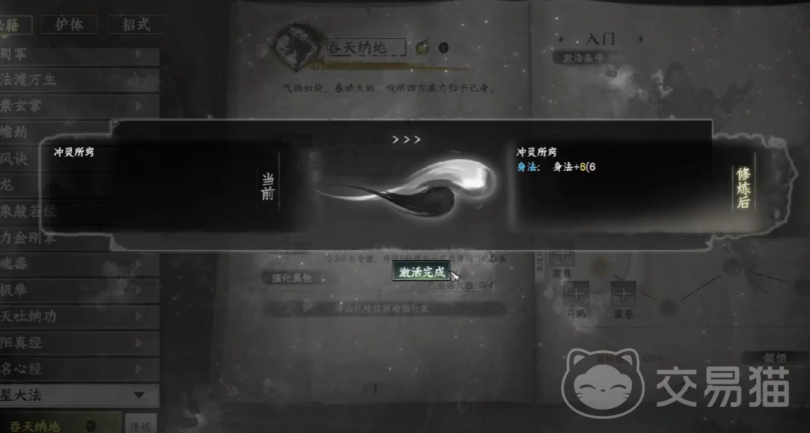 使用吞天纳地需消耗全部真气进行持续吸纳,所恢复的生命与真气数值会根据角色当前阴属性进行比例折算。同时,每五秒可释放一次爆发效果,造成相当于自身阴属性100%的基础伤害。要完全解锁此功法,玩家需完成四次冲脉突破。