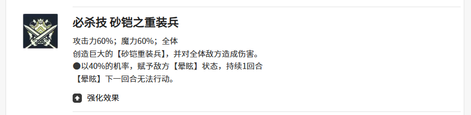 亚雷克德拉的必杀技是砂铠之重装兵,虽然单次攻击力和魔力值仅为60%,但其优势在于覆盖全体敌人,属于范围性输出技能。施放时将召唤出巨大的重装士兵对所有敌方单位造成伤害,并附带40%的概率施加晕眩效果。尽管单体伤害偏低,但由于作用范围广,配合其他技能可形成良好的连锁压制,特别适用于清理多目标战斗场景。