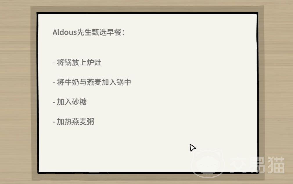 进入室内后的核心任务包含多个环节:准备早餐、唤醒主人、协助剃须、执行晨间仪式等。在厨房准备早餐时,玩家需打开柜子并输入密码235,取出锅具;接着依次加入牛奶、燕麦和砂糖,熬煮完成后方可继续下一步。