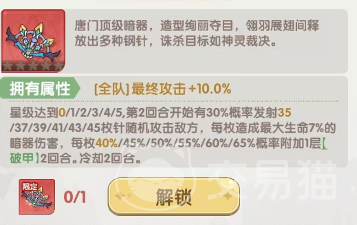 其中最具代表性的当属孔雀翎,这款被公认为唐门顶级暗器之一的装备,外形酷似折扇,展开瞬间可释放大量钢针,形成密集的穿透性攻击。其发射速度极快,命中率高,能够在短时间内对敌方单位造成连续打击。携带该暗器的玩家可使全队攻击力提升10%,极大增强团队整体输出能力。