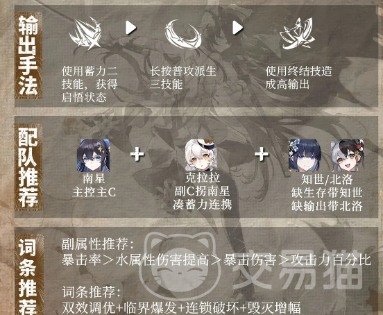关于装备副属性的优先级,建议依次关注暴击率、水属性伤害提升、暴击伤害以及攻击力百分比。由于南星的技能体系以水属性为核心,提升水伤可直接增强所有技能的伤害基数。暴击率需优先堆叠至50%以上,确保输出稳定性,减少未暴击带来的伤害波动。在此基础上补充暴击伤害,进一步扩大暴击时的输出上限。最后通过攻击力百分比强化基础面板,使每一项属性都高效转化为实际战力。特效词条方面,双效调优和临界爆发为首选,前者有助于优化技能衔接节奏,后者则可在关键时刻提升输出峰值。