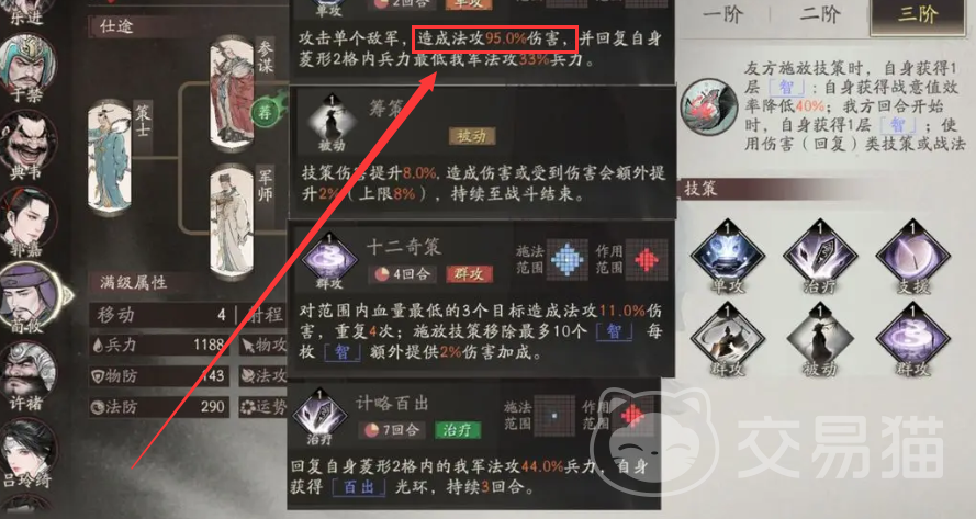 以荀彧为例,他在释放技能时会积累“智”层数,每层可提供2%的额外法术伤害加成,最多叠加十层。其核心技能“十二奇策”可在范围内对血量最低的三名单位发动AOE攻击,共触发四次,每次造成11%的基础法术伤害,并消耗“智”层数以获得增伤收益。此时,杜氏所提供的法术攻击加成和治疗强化效果,正好能最大化荀彧的输出与持续作战能力。